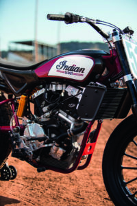 La cylindrée imposée de 750cc dans la catégorie suprême du Flat Track a conduit le service R&D de Indian à réaliser un nouveau moteur. Il s’agit d’un bicylindre à 53° avec 4 soupapes par cylindre à refroidissement liquide. Le taux de compression est de 14.0:1 et le régime moteur délivre 109 cv à 10 000 tours. L’allumage cartographié a été confié à MBE en Angleterre et les injecteurs proviennent de la Scout comme les pignons de boîte de vitesse réduite à 4 rapports et commandés par un barillet en aluminium usiné. Le boitier de filtre à air en fibre de carbone a été très soigné pour maintenir une constance de pression d’air frais vers l’injection.
